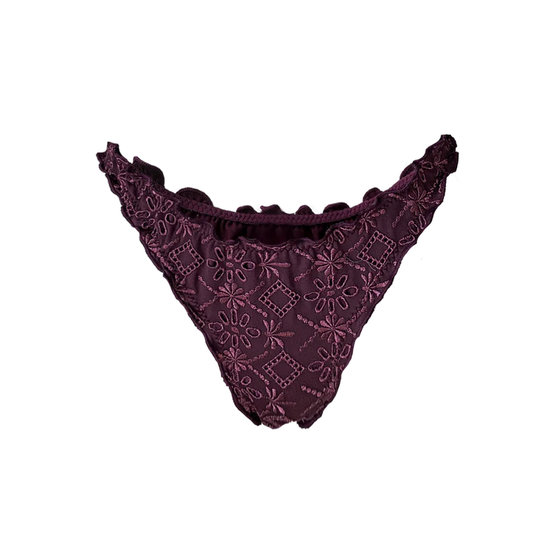Suteikite savo paplūdimio įvaizdžiui jausmingumo su romantiškais nėriniais bei saldžia burgundiška spalva. Subtilaus blizgesio turintys siūlai sukuria gėlėtus motyvus bei dekoruoja parauktus bikinio kelnaičių kraštus. "Moderate" tipo kelnaitės švelniai apgaubia klubus neįsirėždamos į odą, tačiau elastingi šonai užtikrina tvirtą jų laikymąsi.
