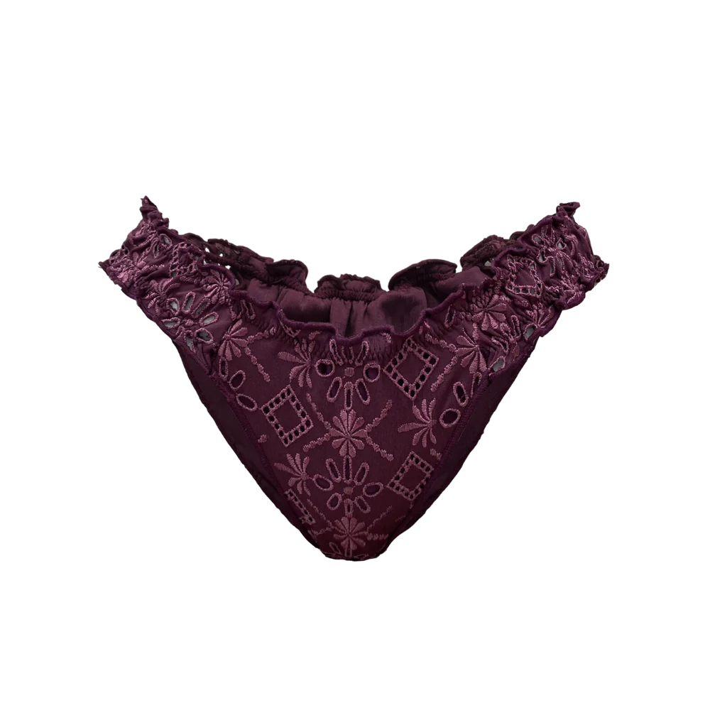 Suteikite savo paplūdimio įvaizdžiui jausmingumo su romantiškais nėriniais bei saldžia burgundiška spalva. Subtilaus blizgesio turintys siūlai sukuria gėlėtus motyvus bei dekoruoja parauktus bikinio kelnaičių kraštus. "Classic" tipo kelnaitės švelniai apgaubia klubus neįsirėždamos į odą, tačiau elastingi šonai užtikrina tvirtą jų laikymąsi.